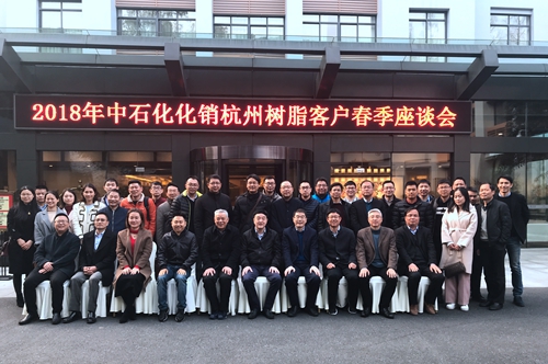 3月21日下午,中石化化销杭州树脂客户春季座谈会在杭州六通宾馆顺利召开,此次会议由控股集团子公司球速(中国)农塑、新光公司联合组织,中石化杭州代表处、中石化杭州地区各主要客户单位合计40余人参加会议。中石化华东公司树脂部经理陈斌康出席会议,控股集团董事长韩新伟、资深顾问陆跃翔到会合影留念并出席招待晚宴。