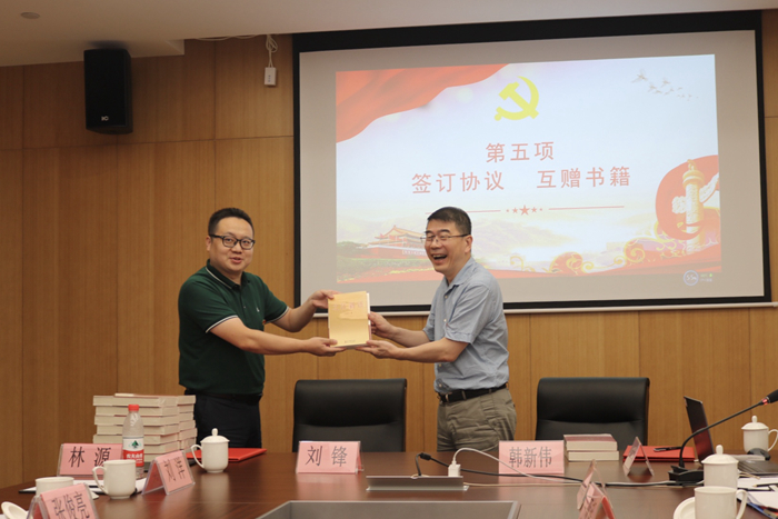 业务交流结束后,刘锋书记、韩新伟书记代表双方支部签订了《基层党组织结对共建协议》并互赠书籍,为下一步加紧合作,实现合作共赢打下基础。