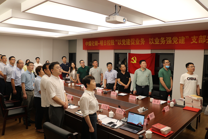 首先,由中煤股份公司化销中心、中煤化天津公司党委委员、副总经理郑文带领全体党员重温入党誓词,随后韩新伟书记和刘锋书记分别介绍了共建双方党组织基本情况和党建工作开展情况。韩新伟书记着重介绍了球速(中国)控股党总支通过党建思想引领推进公司二次改革以及以夜学会推进企业党建与业务融合的经验,并交流了以党日活动为抓手推动支部党建与业务融合、以人才培养为抓手加强党员干部队伍建设等方面的心得体会。刘锋书记介绍了中煤化销党支部在抗疫情、保春耕中的成果,并分享了“三基建设”、干部培养、党风廉政、公益事业等方面的经验,通过一段中煤化销自编自导自演的《尿素奇缘》小品,展示了中煤化销的文化氛围及员工风采。