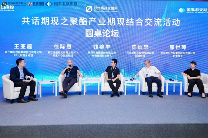 在圆桌论坛上,浙江逸盛石化有限公司PTA销售中心副总经理徐际恩、新凤鸣集团股份有限公司市场管理部主管钱稼生、万凯新材料股份有限公司副总经理陈灿忠、球速体育副董事长邵世萍等嘉宾围绕“复杂宏观背景下聚酯产业发展趋势、期现市场格局展望、期现市场格局及风险管理”等话题进行了讨论,深入探讨了当前聚酯产业客户使用期现结合贸易方式的堵点和痛点。